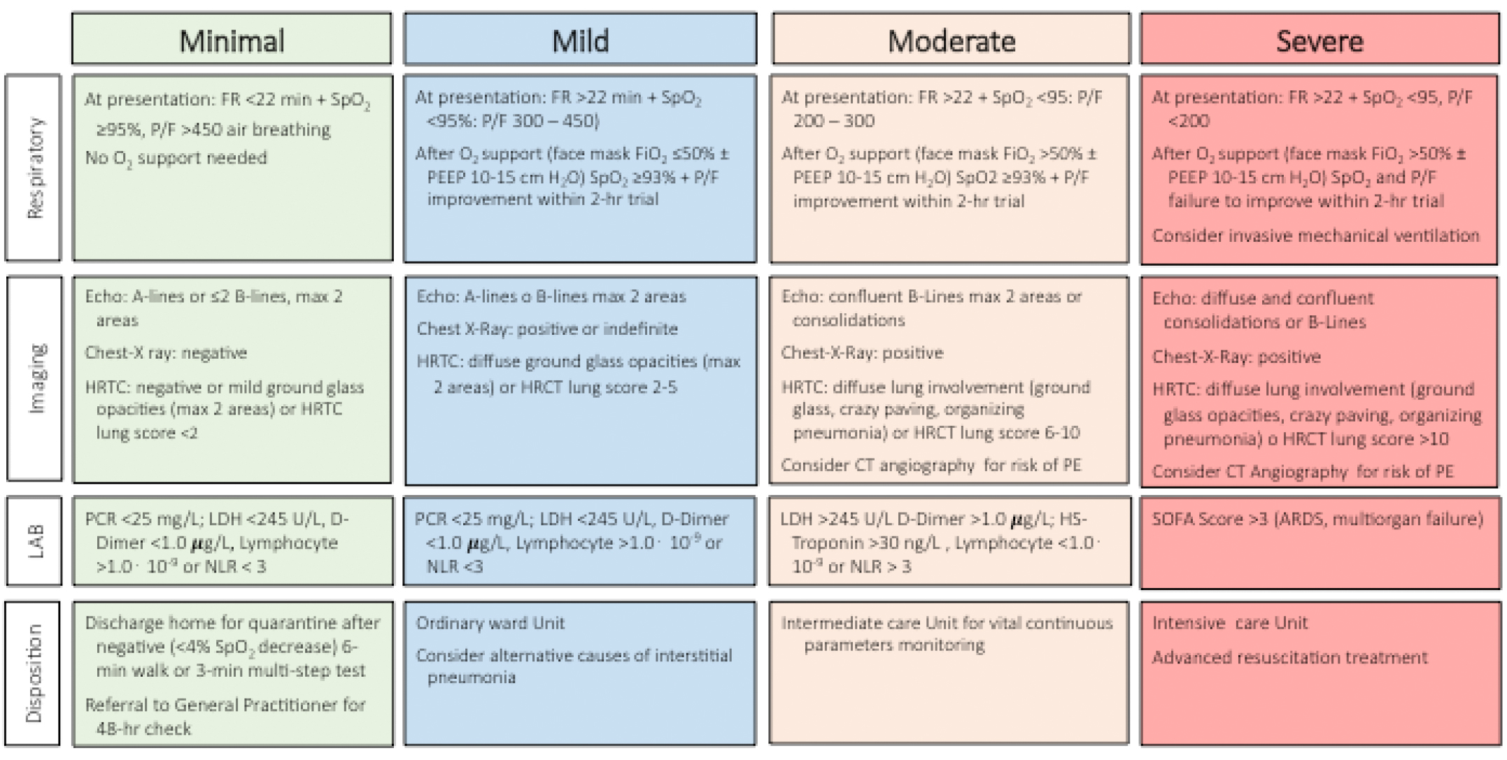 Minimal Risk: It includes patients attending ED with a respiratory rate (RR) <22 breaths/min, arterial oxygenation (SpO2) >95% in room air and PaO2/FiO2 index (P/F) >450. SpO2 under effort (6-min walk test or 3-minute step test) is limited to less than 4%. No comorbidities or other risk factors are present (no cardiovascular diseases, diabetes mellitus, renal failure, chronic respiratory diseases, obesity, immunodepression, neoplasms, malnutrition, liver diseases, smoking or pregnancy) and age is <70. The lung parenchyma at imaging is normal or mildly impaired (ground glass lesions in <2 lung areas or HRCT score ≤2). Laboratory findings are normal.