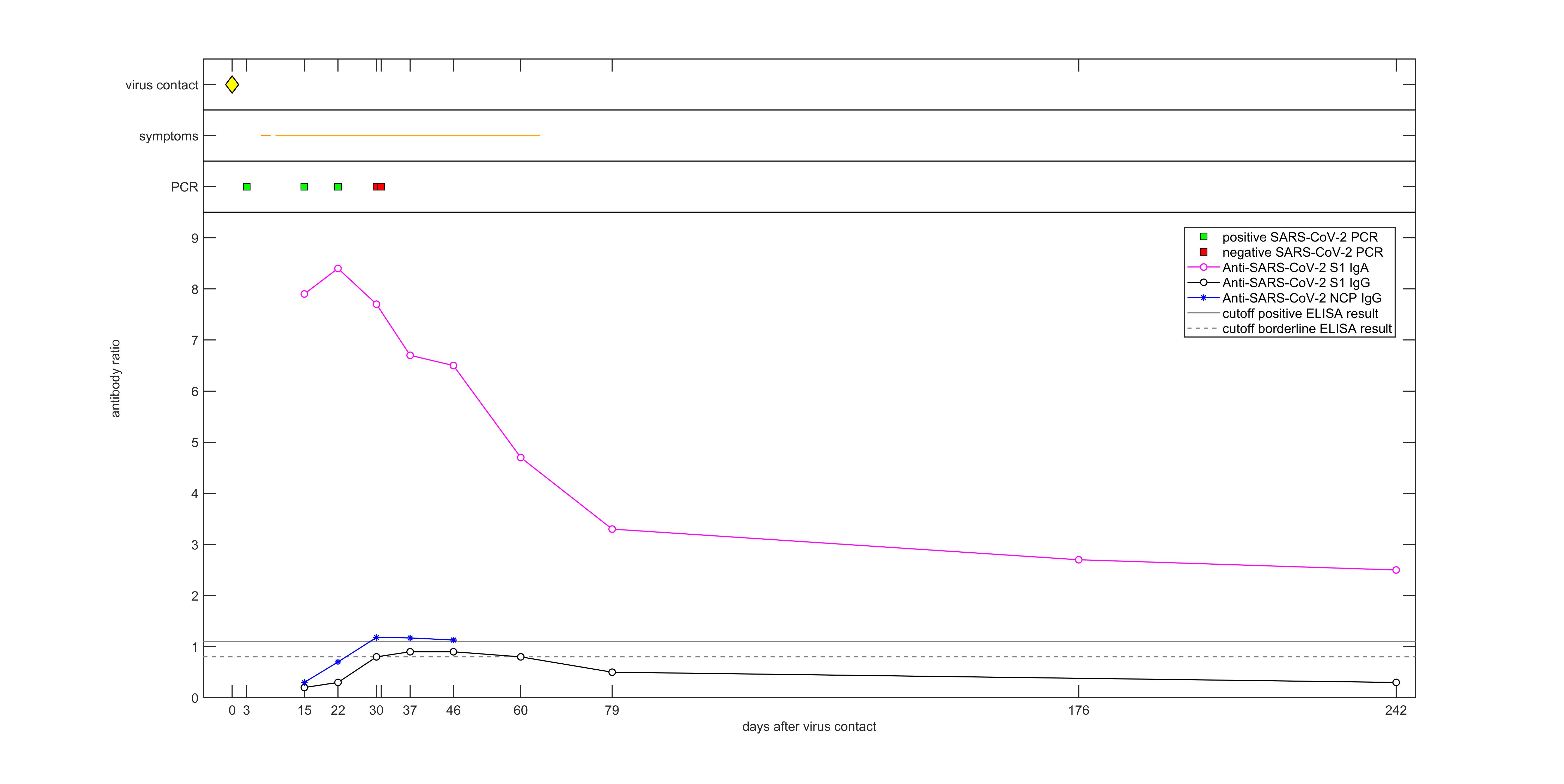 Figure 1: Timeline of virus contact, symptoms, PCR results and longitudinal titers of anti-SARS-CoV-2 antibodies against the nucleocapsid protein (NCP) and spike protein (S1).