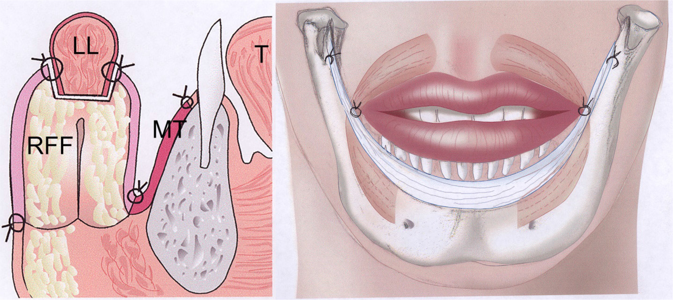 Figure 4: a) Schematic lateral view: T = tongue, RFF = radial forearm flap, MT = mucosal graft, LL = lower lip. 4b) Suspension of the lower lip by fascia.