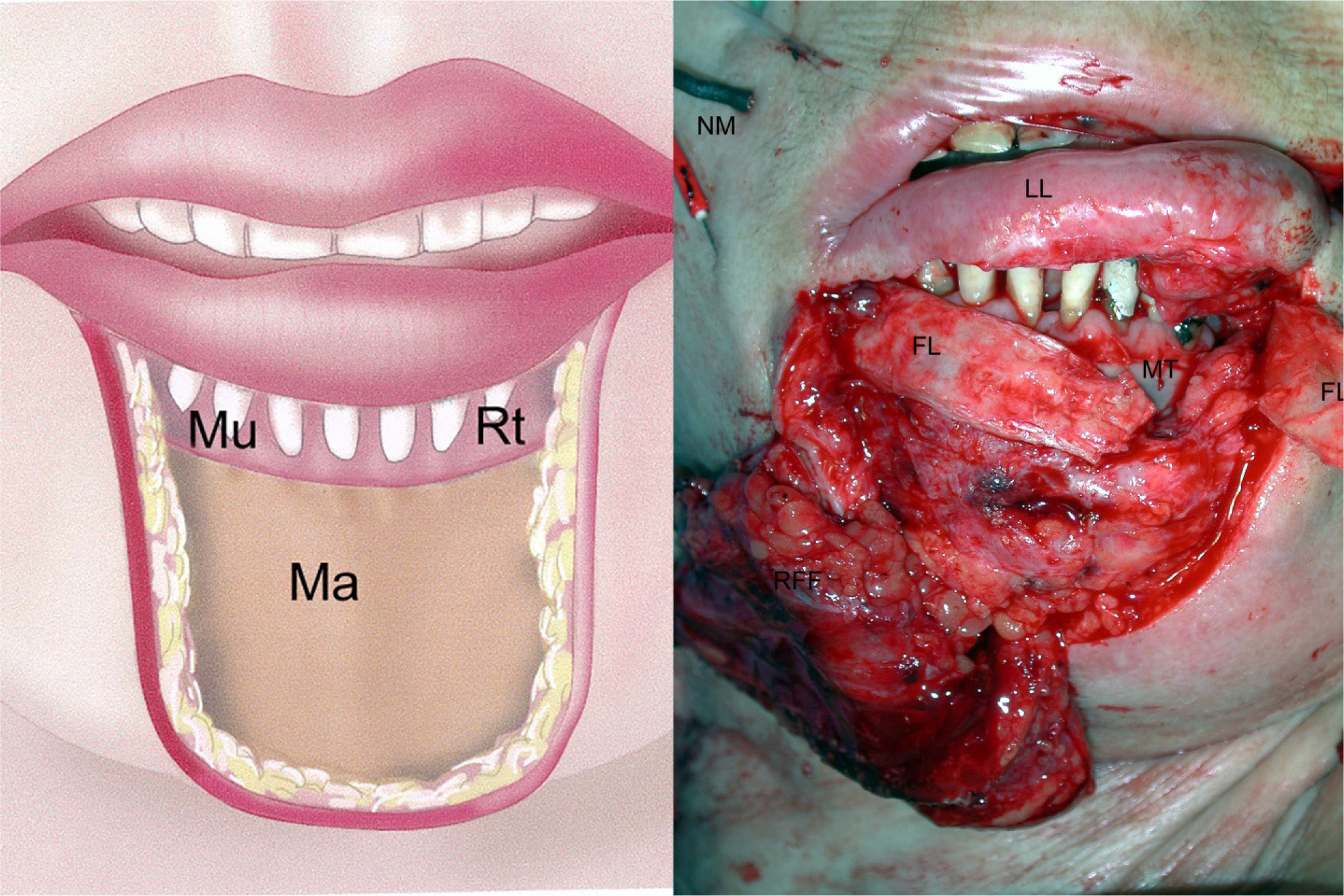 Figure 3: a) Schematic illustration of the resection: Ma = mandible, Mu = mucosa, Rt = root of teeth b) LL = lower-lip vermilion, MT = mucosal graft sutured in place, FL = fascia lata sling, RFF = radial forearm flap, NM = electrodes used for facial nerve monitoring.