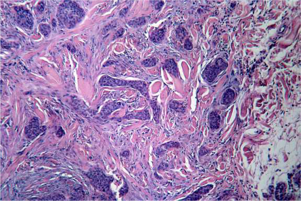 In March 2001 the tumor was excised to a c1ear margin (RO). Tumor resection was complemented by bilateral neck dissection (20 tumor-free lymph nodes right, 21 tumor-free lymph nodes left). A platysma flap prepared during neck dissection with its pedic1e based at the mandible was used to cover the defect [1, 2]. The flap was positioned without tension, and the course of wound healing was unexceptional at first. Histopathological examination disclosed a desmoplastic, blue-cell tumor with superficial tubular growth, and a microcystic adnexal carcinoma (= sclerosing sweat gland carcinoma) was diagnosed.