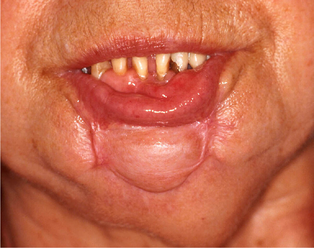 In May 2001, 45 days after surgery, a wound-healing disturbance necessitating local measures was noted in the vincinity of the platysma flap. Despite revision, scar contracture developed involving the entire lower lip, which lost its function increasingly over time.