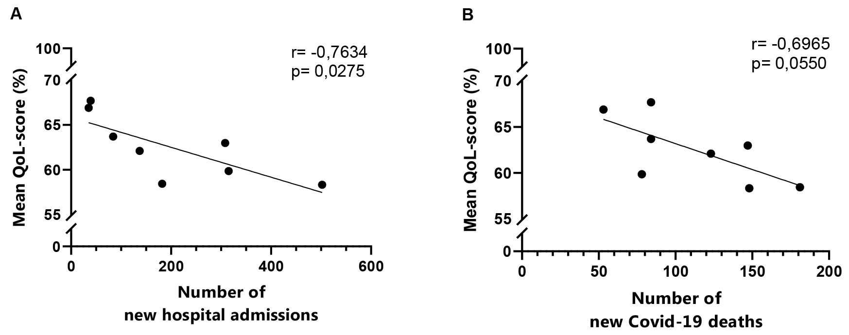 During the peak of the pandemic, mean QoL in HCW was significantly worse compared to QoL-scores prior to the pandemic (p<0.001). Eight weeks after the peak of the pandemic, QoL-scores improved but were still significantly worse compared to the pre-pandemic data (p= 0.004), indicating a prolonged negative effect of the pandemic on QoL. During the pandemic higher numbers of hospital admissions, and higher COVID-19 mortality rates, as reported by the Dutch government, correlated with lower QoL scores in HCW (r = –0,763, p = 0,028, and r = –0,697, p= 0,055, respectively, Figure 1).